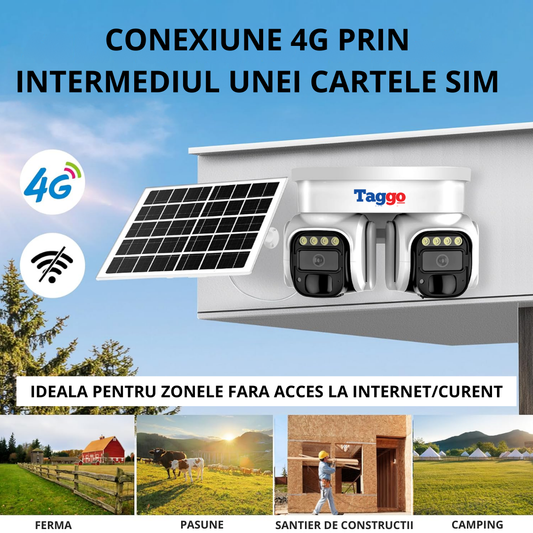 Camera de supraveghere 4G 4K, Panou solar 20W, 2 lentile 360 , Detectie dubla, Control din aplicatie, Comunicare bidirectionala, Urmarire automata