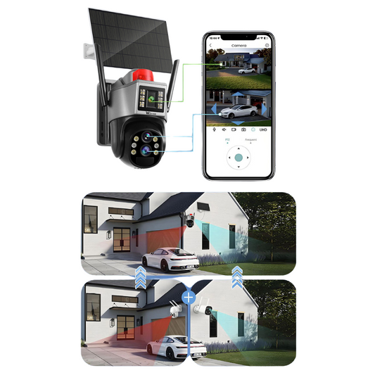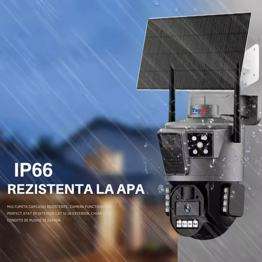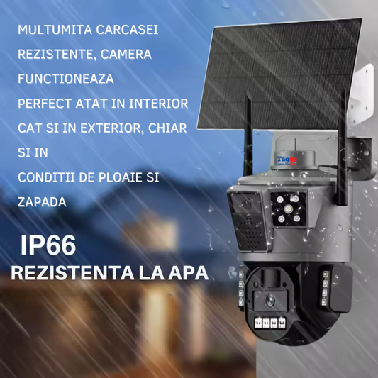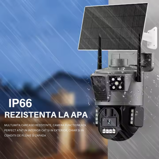 Camera de supraveghere cu incarcare solara, 4G, cu Lentila Dubla, Baterie 10.000mAh, Consum redus de energie, Rezistanta la apa IP65