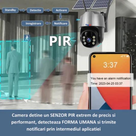Camera de supraveghere cu panou solar 4K, conexiune WIFI, Zoom 10X, Control din aplicatie, Detectie umana, Urmarire automata, IP66