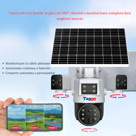 Camera de Supraveghere, Crocodil, Solara 4G, Inteligenta cu 3 Lentile Rotative, Viziune Nocturna Color si Infrarosu, Urmarire Automata si Control de la Distanta