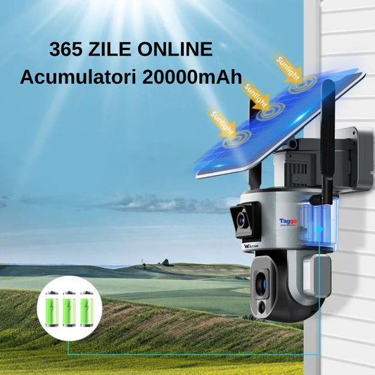 Camera Supraveghere 4G 4K Ultra HD, 24 ore online, Dual Camera 360, Incarcare Solara, Rotire Din Aplicatie, Rezistenta La Apa IP 66, Card Memorie 64GB