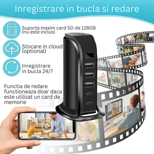 Camera spion in statie de incarcare, Wi-Fi, Full HD, senzor de miscare, 20W, 1x USB-C, 4x USB-A