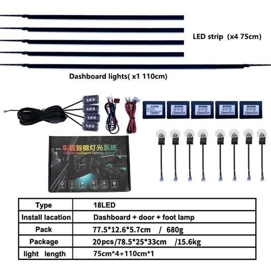 Kit Lumini Ambientale RGB 12V pentru Interior Auto, 18 în 1, Acrilic, 64 Culori, Iluminare Bord, Usi, Manere, Podea, Efecte Premium, Control prin Aplicatie