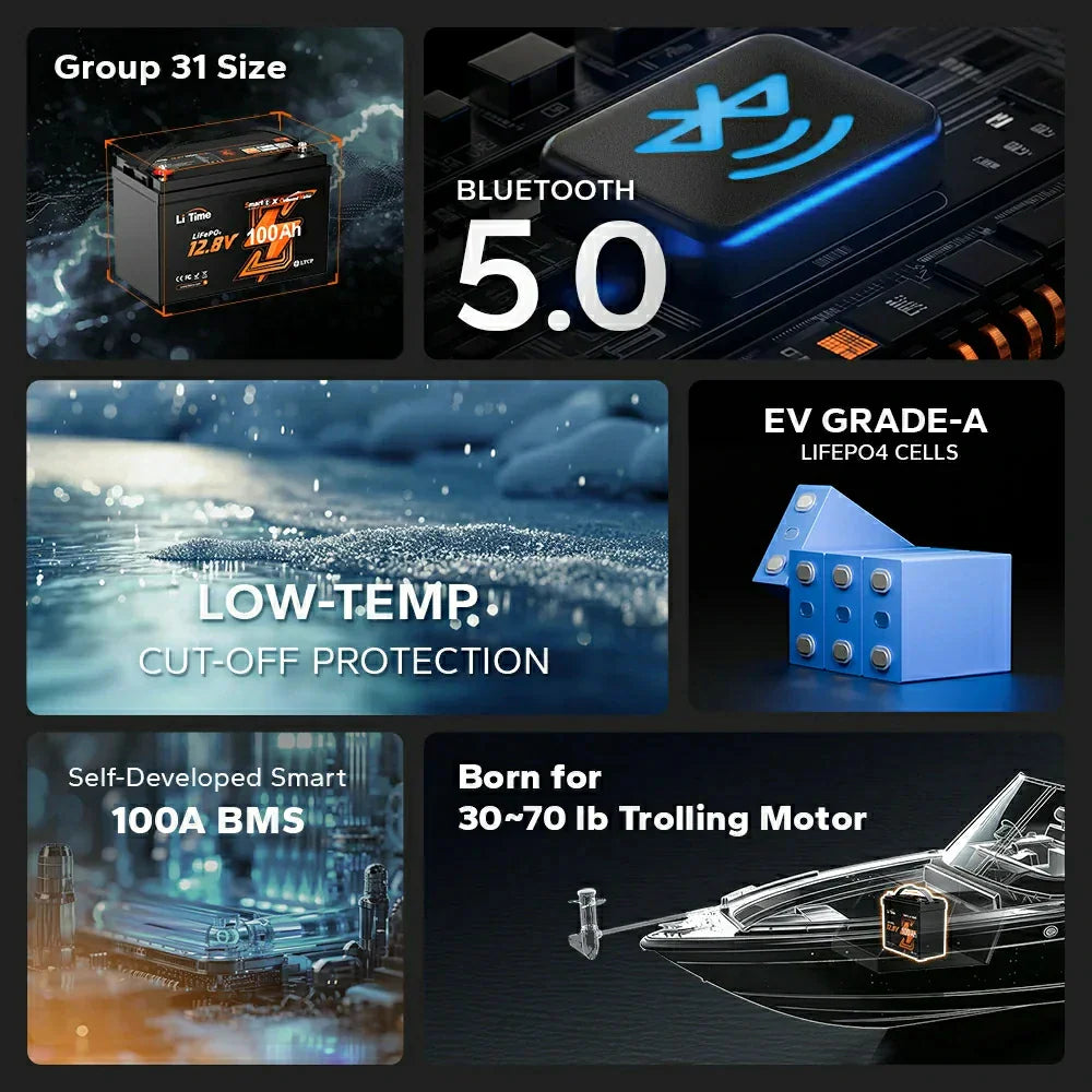Baterie LiTime 12V 100Ah LiFePO4 pentru motor electric barca, Bluetooth, BMS 100A, 1280Wh, pentru Outboard si Trolling Motor