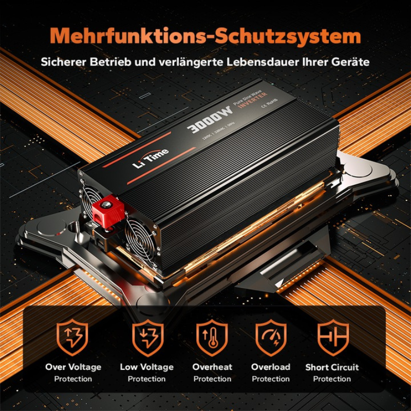 Invertorul auto LiTime 3000W transforma tensiunea de 12V DC a bateriei intr-o alimentare stabila de 230V AC, fiind ideal pentru alimentarea echipamentelor electrice sensibile, atat in deplasari, cat si in sisteme off-grid.